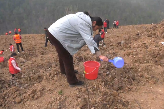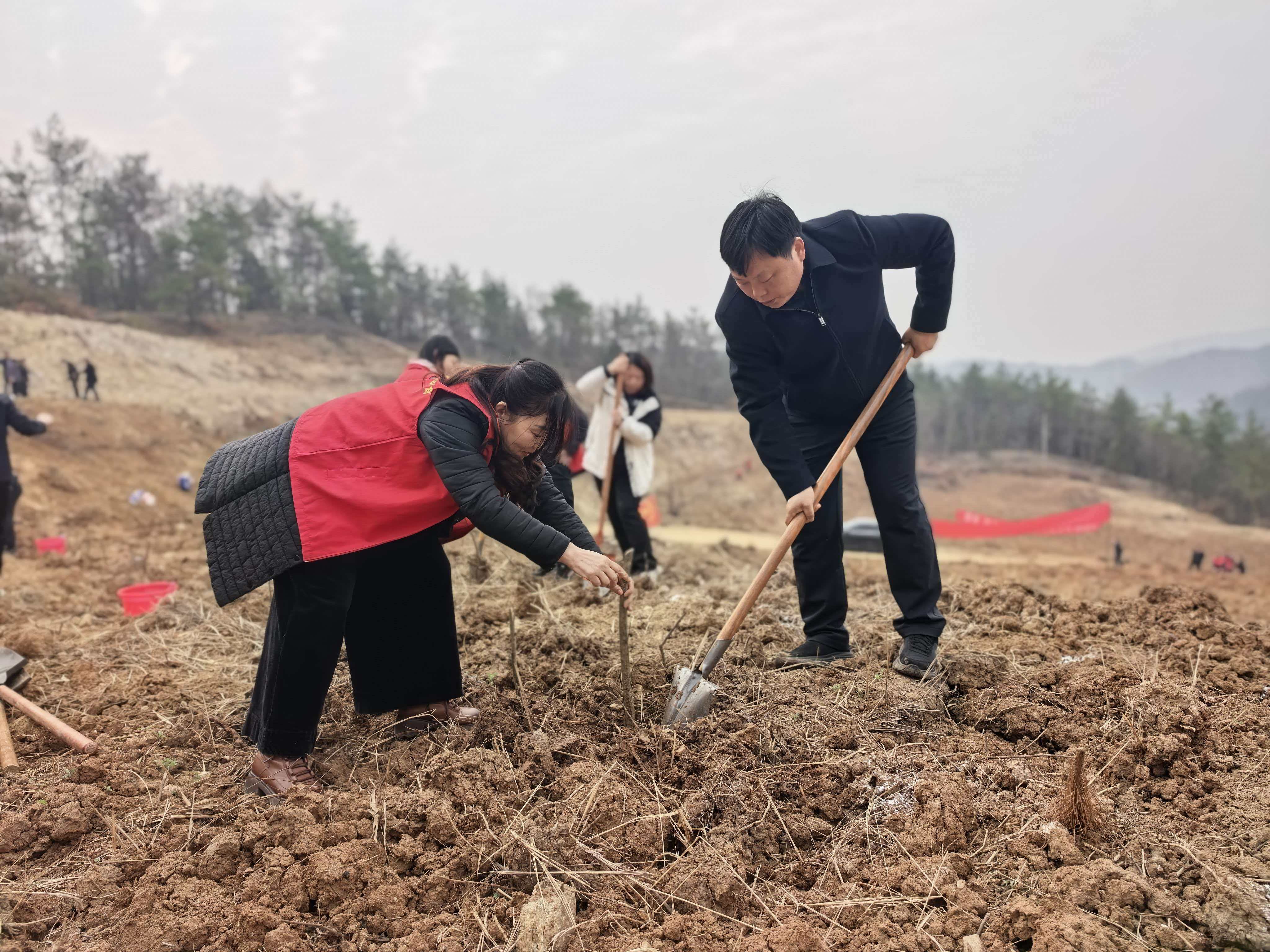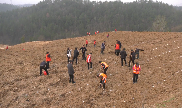 3月13日,郧阳区城关镇党员干部群众在桃花沟村中药材基地开展植树活动。