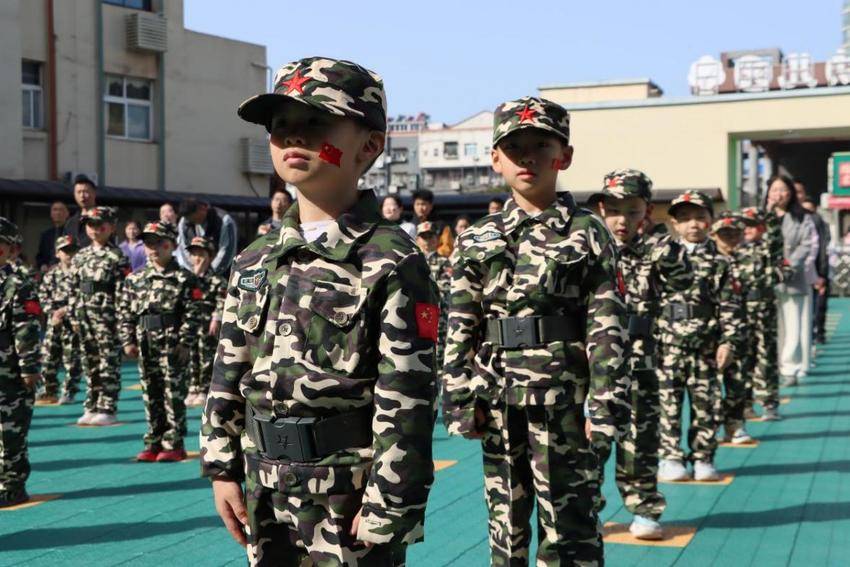活动在嘹亮的国歌、庄严的升旗仪式中拉开了帷幕。开幕式后,孩子们身穿迷彩服,脸上洋溢着兴奋与喜悦,在教官的组织下整齐列队,重温了党旗、国旗、军旗的知识,并在教官的指导下,有模有样地握拳立正,学习了站军姿和行军礼等有关知识,亲自佩戴体验了仿真狙击枪、步枪等军用器械。活动还特别设置了亲子项目,家长以“战友”身份与孩子携手完成挑战,现场气氛温馨而热烈。亲子并肩作战不仅增进了情感交流,也让国防教育在爱的互动中自然传递。