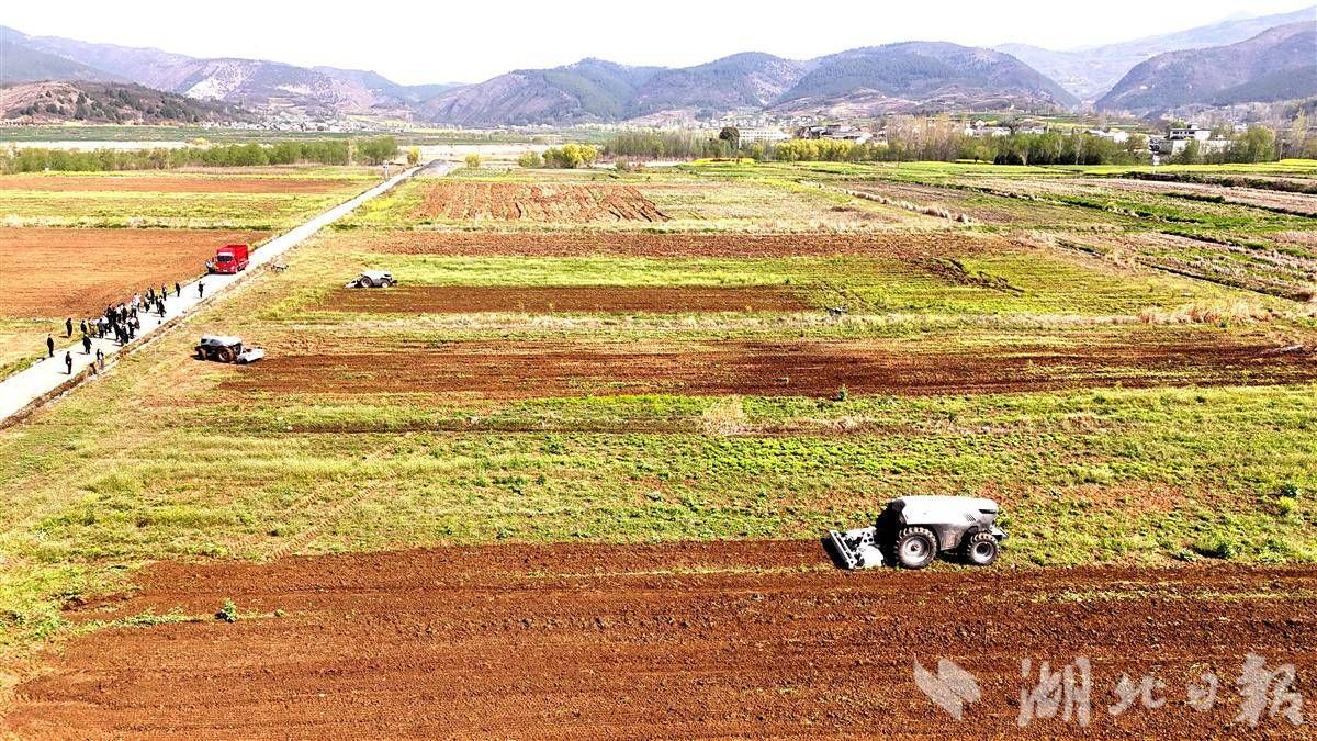3月27日,湖北省十堰市郧阳区在安阳镇李营村伏羲农场举办了一场别具一格的春播备耕现场会,无人驾驶的智能农机在田地里来回穿梭耕地耙地一气呵成,无人机低空盘旋施肥播种一次完成,参加现场观摩的村民直呼不可思议、科技感拉满。