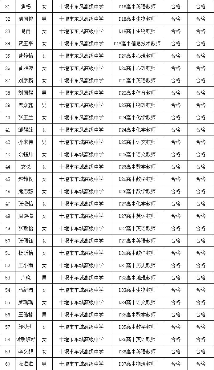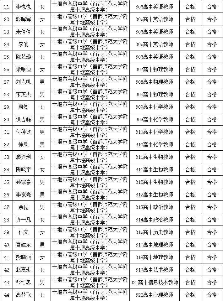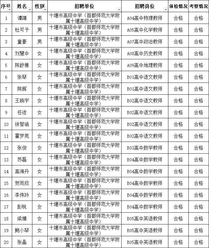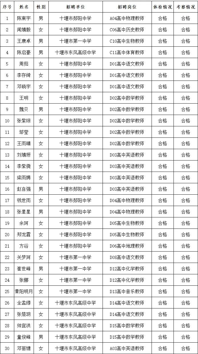 根据《十堰市高级中学(首都师范大学附属十堰高级中学)2026年公开招聘教师公告》和事业单位公开招聘有关文件规定,经报名、考试、体检和考察,现将谭靖等44名拟聘用人员名单予以公示。