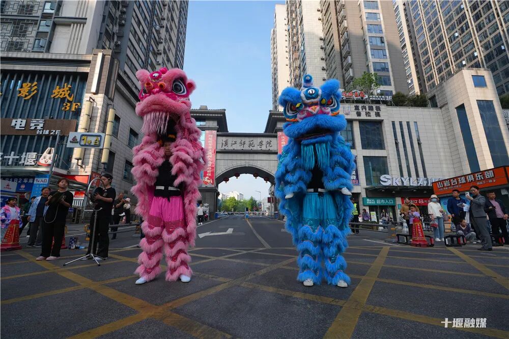 汉江师范学院门口,舞狮表演为选手加油助威。