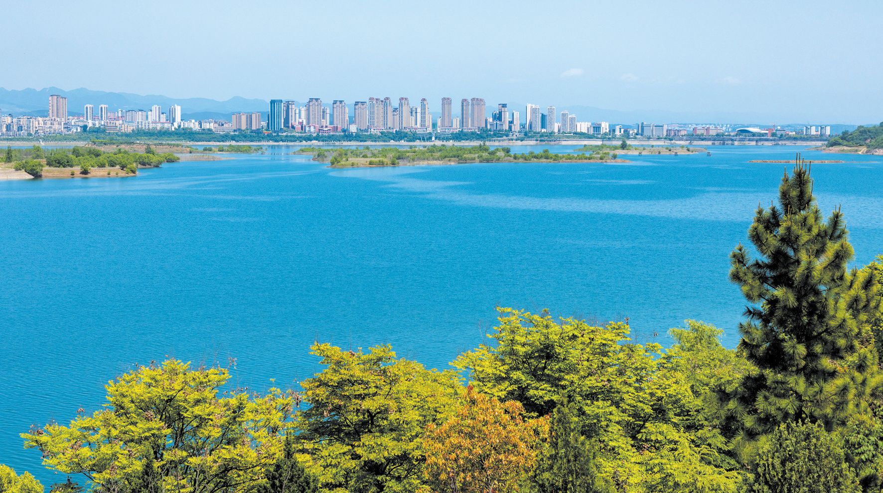 4月25日,记者拍摄的郧阳区郧阳湖国家湿地公园,一汪碧水与城市楼宇相映成趣,勾勒出“城在景中、水在城中”的生态图景。