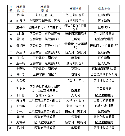 注:区领导因工作职务调整的,由继任者接任;联系单位作为区级河湖长服务部门,要主动同河湖长对接并履行相应河湖长工作职责。